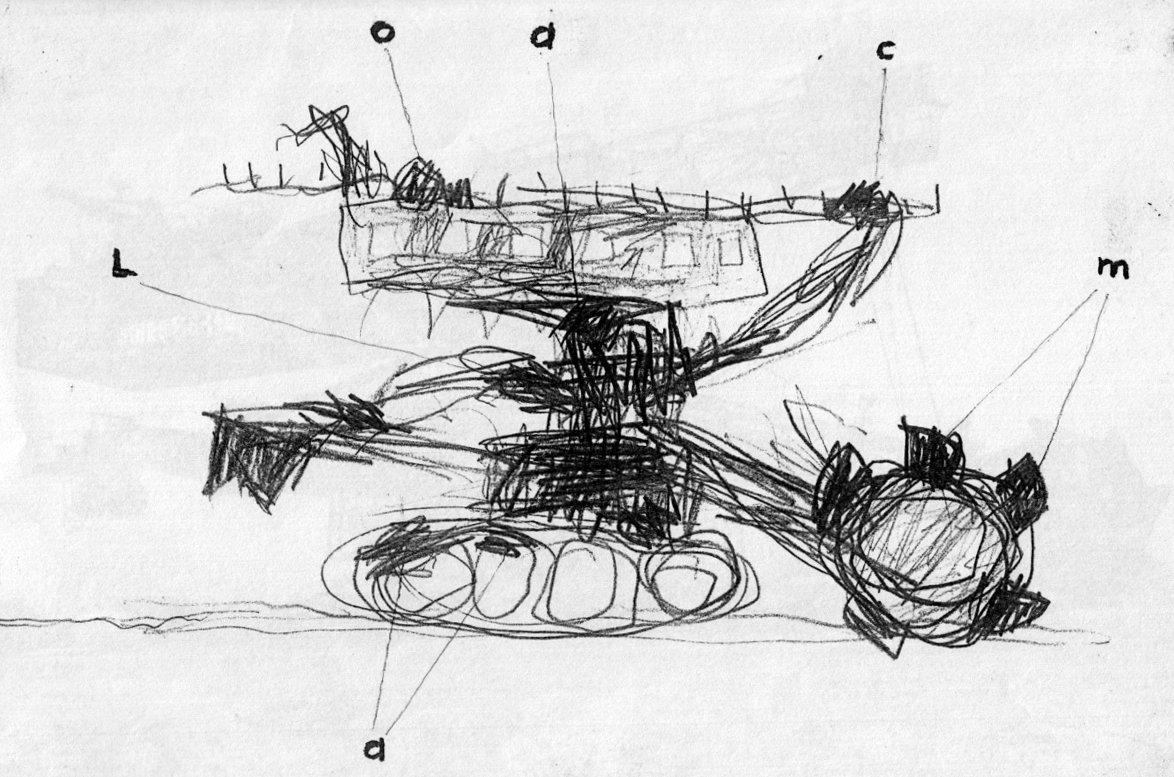 Lacoma. 1992. 14 x 3 m. Wort-Skulptur aus Teilen eines Tagebau-Baggers. Motorenverkleidungen, Radkappen, Eimer des Schaufelrades, Schurre, Stahlträger. mit einer Bagger-Brigade der Lausitzer Braunkohle AG während der Verschrottung des Baggers. Standort: Bundesstraße 169, Höhe Leuthen, bei Drebkau, Lausitz. Die Skulptur und der während der Arbeit entstandene Videofilm Lacoma waren die Meisterschülerarbeit an der Hochschule der Künste Berlin bei Professor Boës.