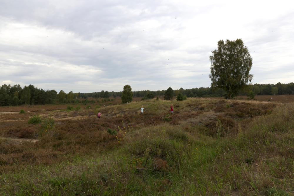 Exkursion Nr. 1: Heide. Die Wittstock-Ruppiner Heide ist ein ganz besonderer Natur-Raum im Land Brandenburg, in Deutschland und in Europa. Sie war nicht mehr so lila im September, doch wir hatten einen herrlichen Tag. Anna, Nele, Hannah, Klara, Holly, Zoe, Lotti, Otto, Emil, Jan und Matti zeichneten, malten, sprayten, bauten mit Fund- stücken, inszenierten sich in der Natur und verschwanden immer wieder im Wäldchen und im Kraut.