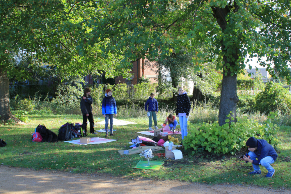 Exkursion Nr. 2: Bleichwall, Wittstock. Am Bleichwall in Wittstock wohnt die alte Linde. Und neben ihr steht ihre Freundin, eine etwas jüngere Linde. Unter diesen beiden Bäumen am Flüsschen Dosse waren die Schüler*innen der 6. Klasse grenzenlos produktiv. Sie hatten viel Material mitgebracht und erforschten im Freiluft-Atelier, was geht.