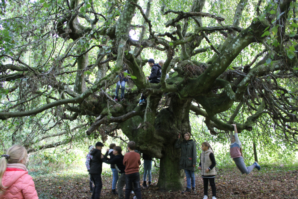 Exkursion Nr. 3: Babe bei Neustadt Dosse. Mit den Schüler*innen der 5. Klassen fuhren wir nach Babe, um den Drachenbaum zu besuchen. Diese alte Buche ist schwer zu finden. Herzlinde Klawe führte uns hin. Als die Kinder in ihr Blätterkleid eintraten, gingen sie im Gänsemarsch und sprachen kein Wort. Vielen Dank Frau Klawe, Frau Wolters und Frau Koch.