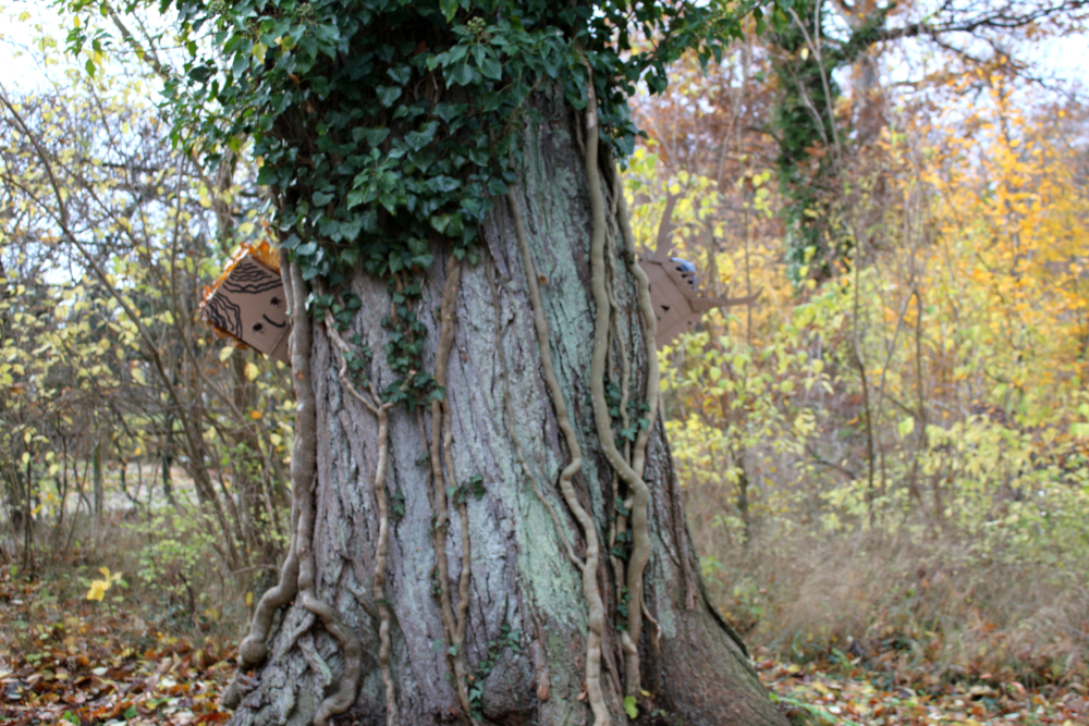 Exkursion Nr. 4: Rheinsberg, Schlosspark. Im Oktober haben die Schüler*innen der 12. Klassen Masken gebaut, um sich im Schoßpark zu inszenieren. Wir probierten verschiedene Orte und trafen eindrucksvolle alte Bäume. Als wir hinterher die Fotos sichteten, bekamen alle Lust, die Grotte und die kluge Nymphe Egeria zu zeichnen.
