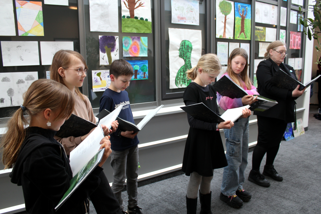 Lesen aus unserem Buch bei der Eröffnung der Ausstellung mit (von links) Martha, Feline, Nils, Meira, Anni, 4. Klassen