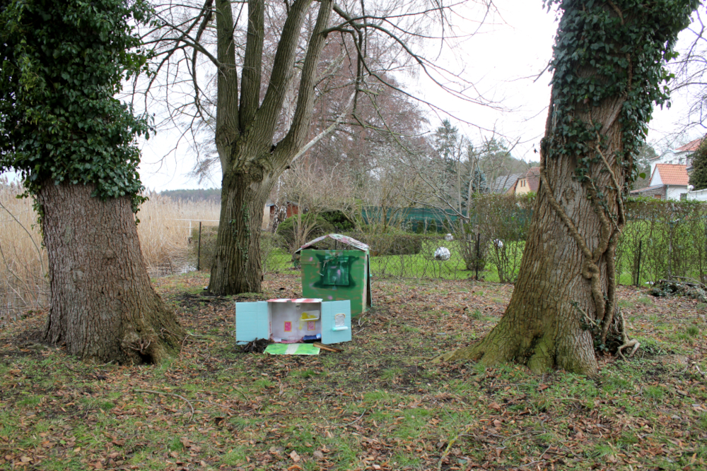 Exkursion Nr. 5: Lindow, Wutzsee. Die Schüler*innen der 6. Klassen und ihre Häuschen aus Recyclingmaterial reisten nach Lindow. Am Wutzsee siedelten die Häuschen und wurden weitergestaltet.