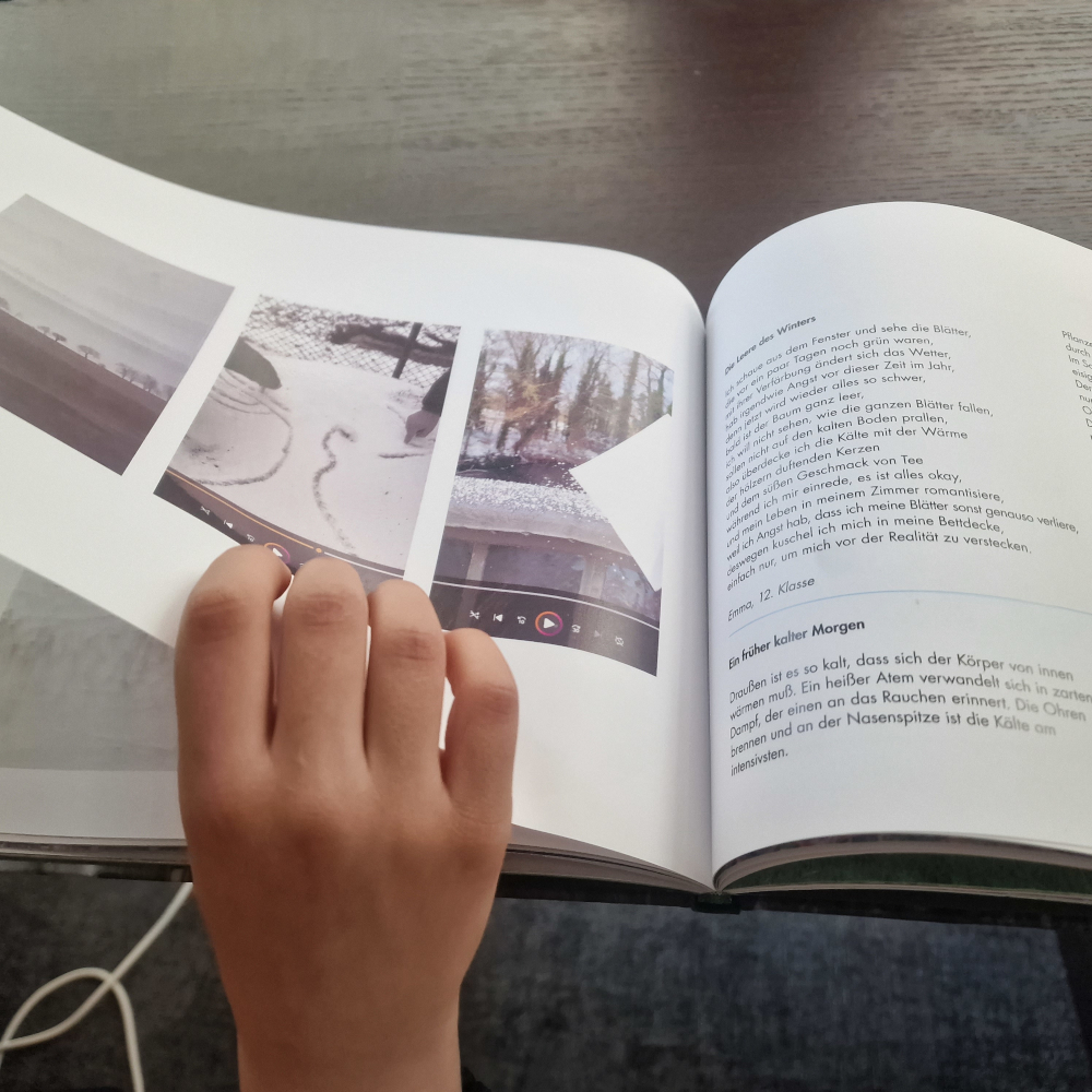 Blättern in unserem Buch. Kapitel Fehrbellin, mit Schüler*innen der 12. Klasse. Foto: Jana Kühn, Plattform Kulturelle Bildung