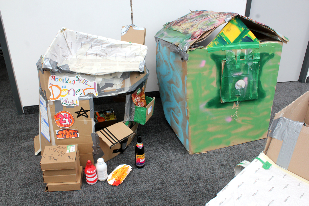 Siedlung, Installation aus Recycling-Material. Mädchen, 6. Klasse