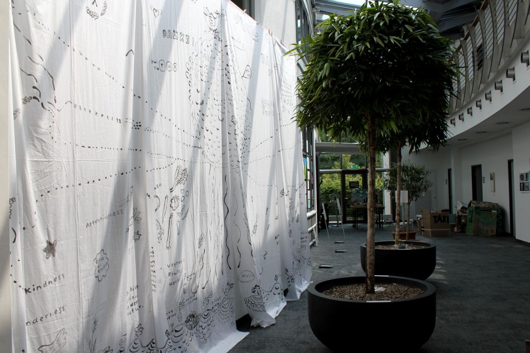 Annett Glöckner. Age of Aquarius. 2023. Textilarbeit. 11,20 x 3,70 m. Acryl auf Batist. Text Annett Glöckner, Zitate