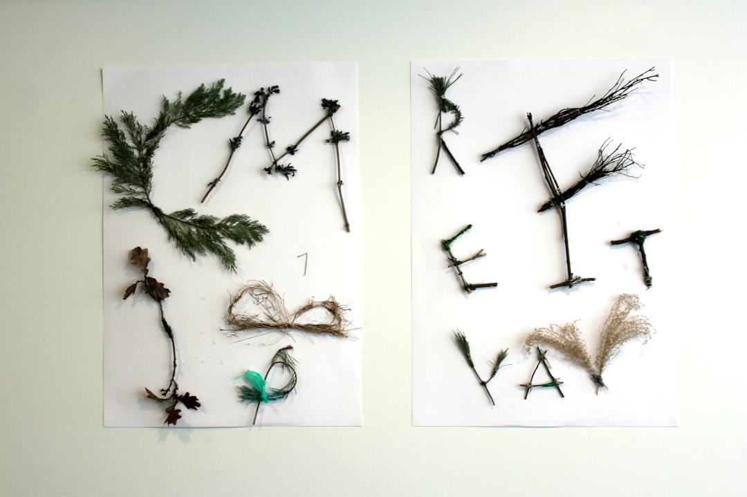 Buchstaben aus Zweigen und Gräsern. Schüler*innen aller Altersstufen. Versalien für das Buchprojekt