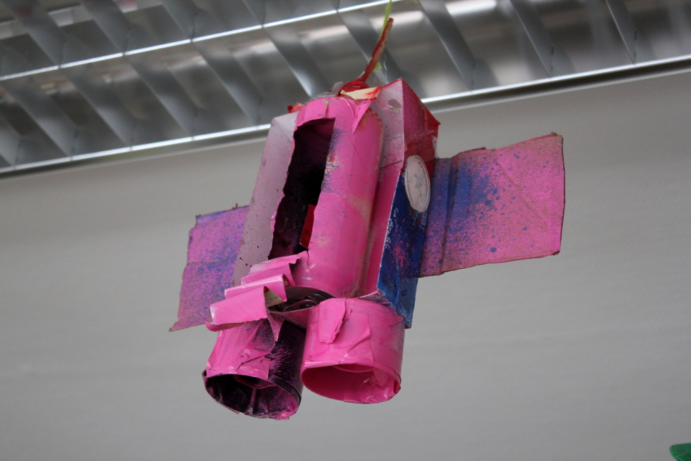Weiteres Material: Behälter aus Pappmaché, Pappe, Papier, verschiedene Klebestreifen, Kleber, Heisskleber, Acrylfarbe, Lackspray, Gipsbinden. Es gab Schüler, die lieber Planeten formten und Schüler, die Bilder vom Kosmos malten oder Logos zeichneten.