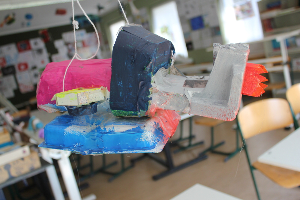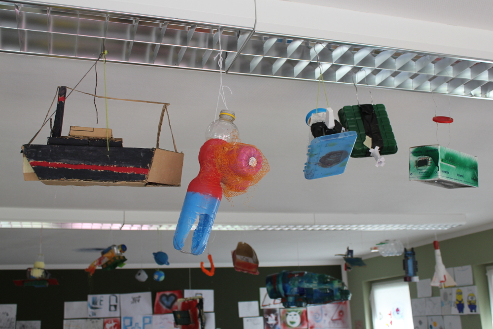 Wir haben über Weihnachten Plastikverpackungen und aussortierte Dinge aus Plastik gesammelt und Flugobjekte daraus gebaut.