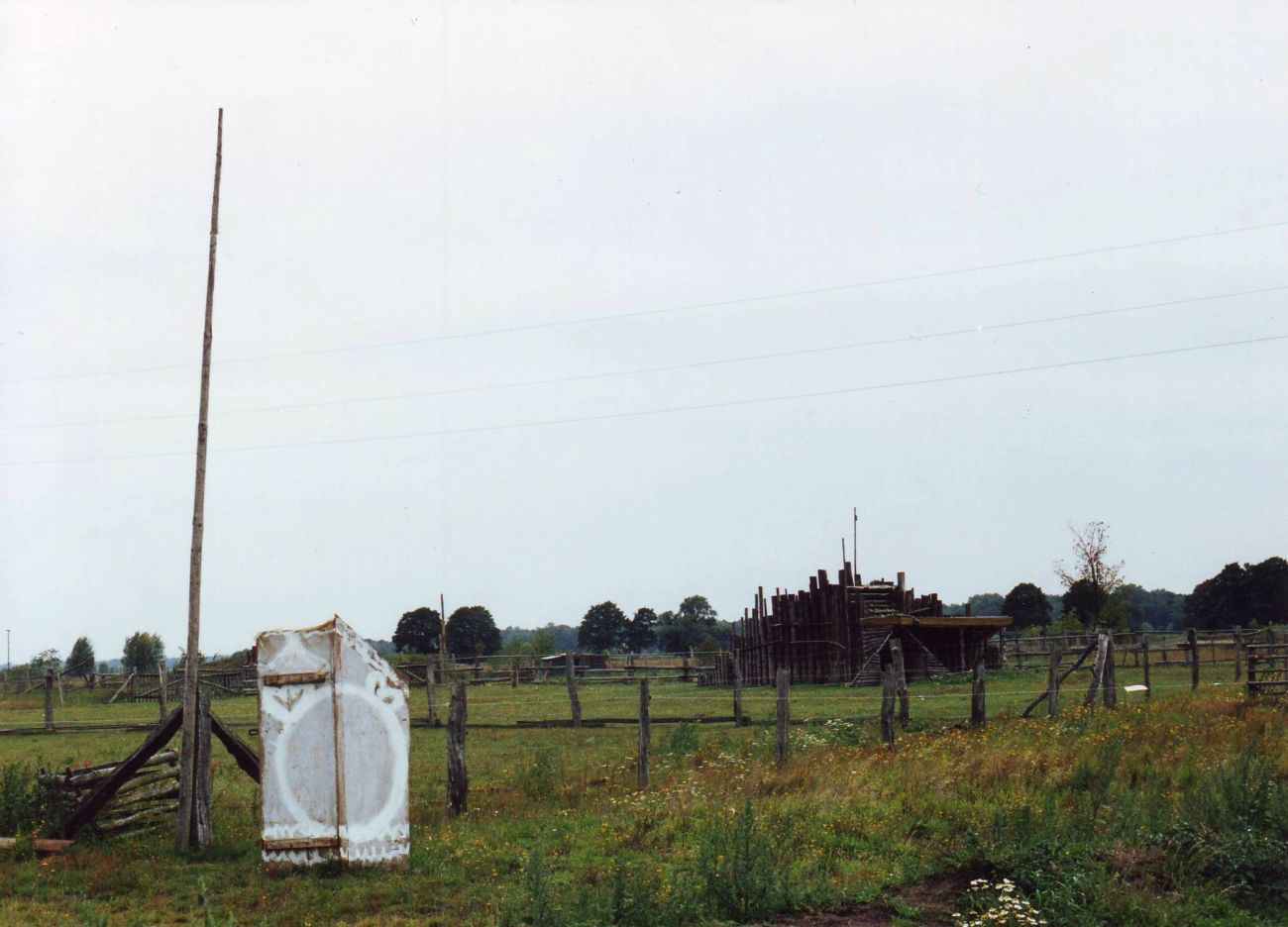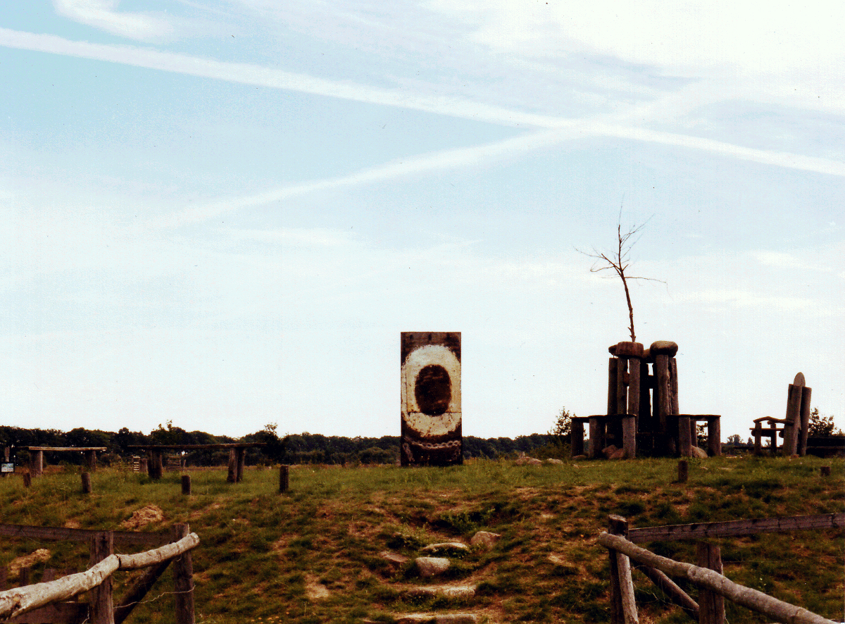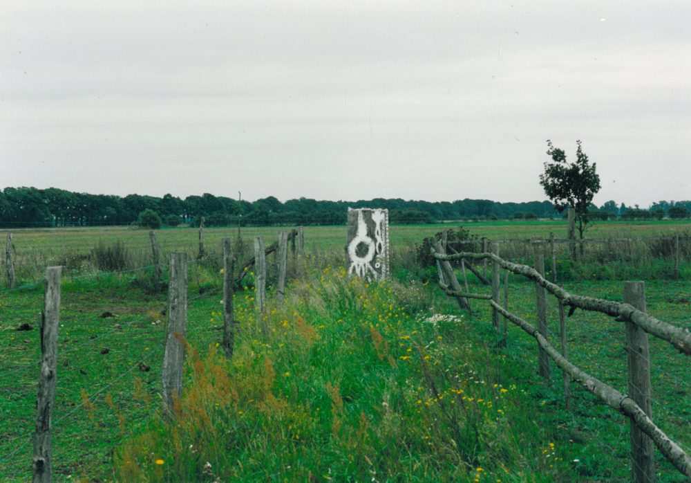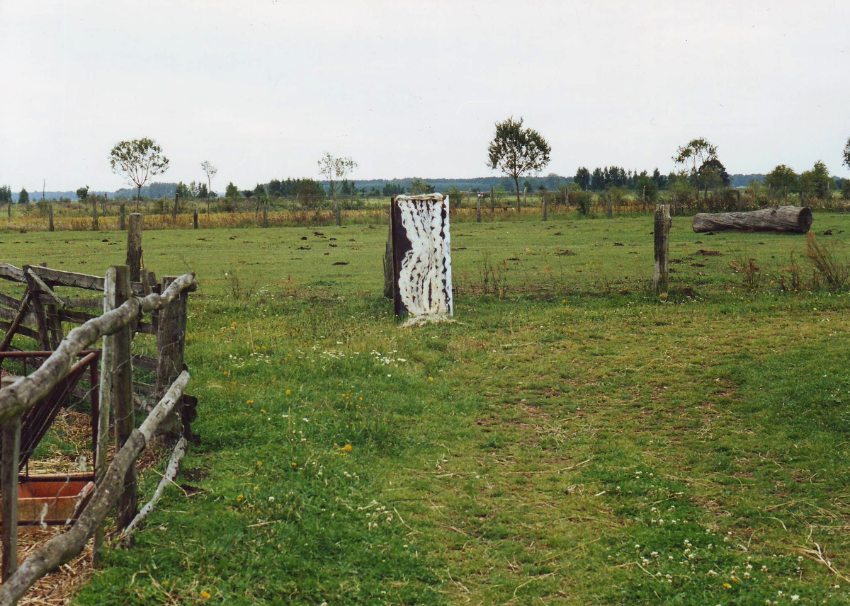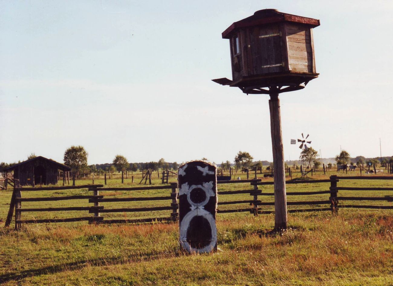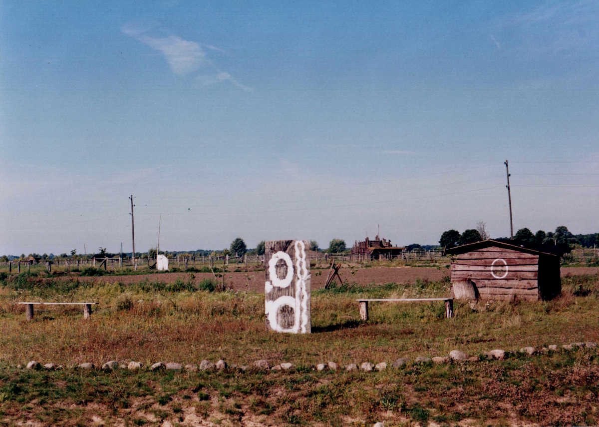 Grasland. 2000. temporäre Installation mit Objekten auf dem Gelände des Haustierparks Babe, Landkreis Ostprignitz-Ruppin. Acryl gezeichnet mit der Hand auf gefundenes Material – Türen, Räucherkammertüren und Paletten, Sisal, Hanf, Latten, Schrauben. mit freundlicher Unterstützung des Teams Haustierpark Babe und Jens Cencarka-Lisec