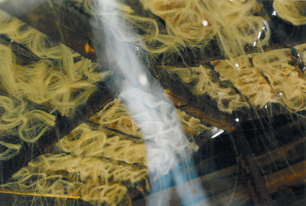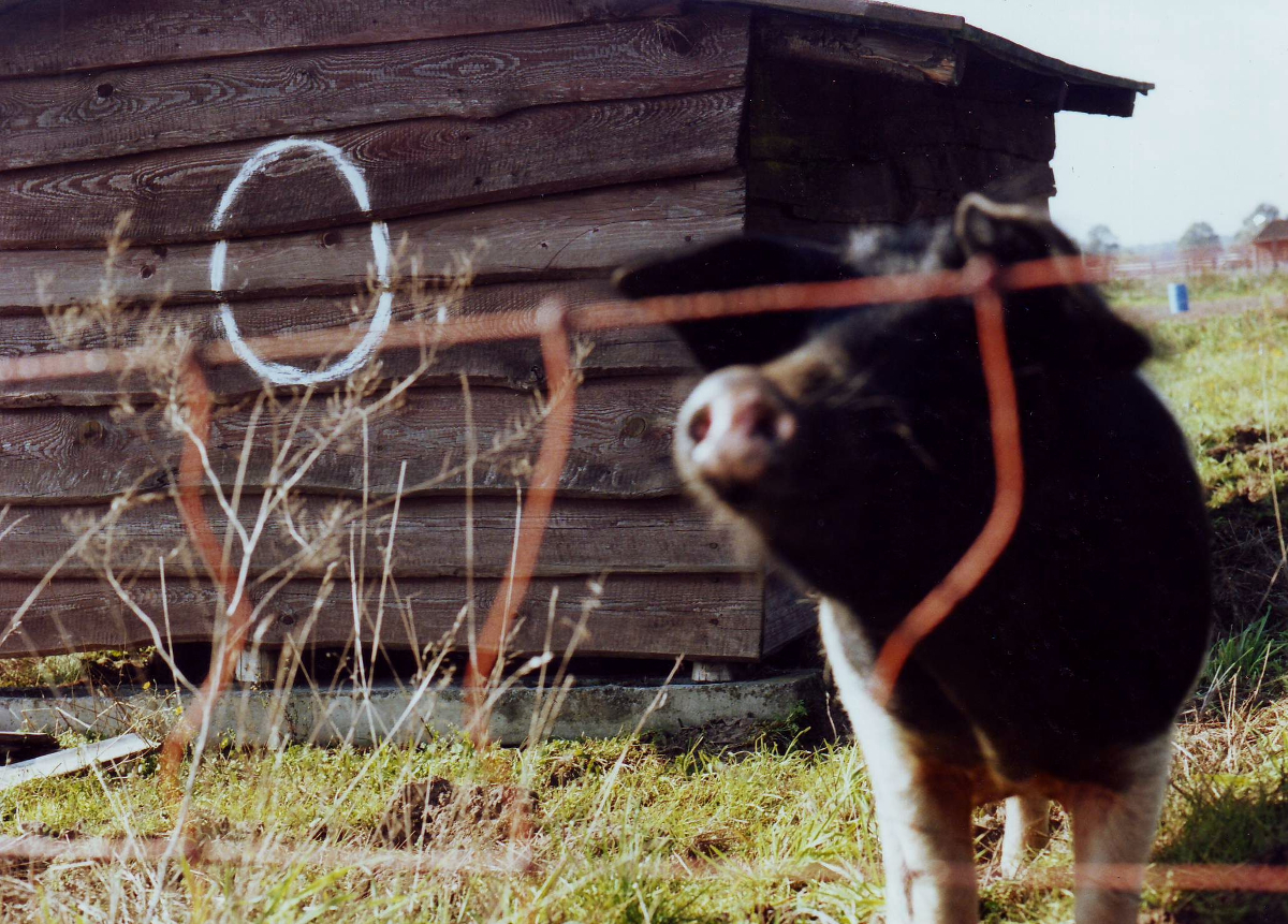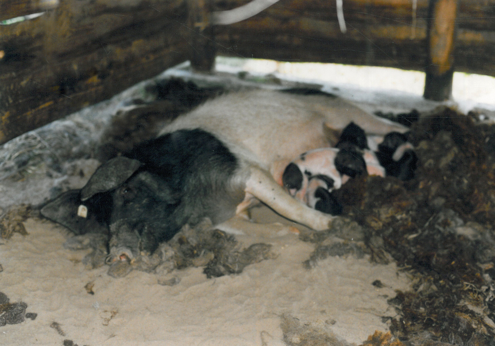Eines Nachts brach das Schwein aus seinem Gehege aus. Es ging in das Häuschen, das Teil der Installation und auf dem Boden und an der Decke mit Sisal und Hanf ausgekleidet war, und gebar dort viele Junge.