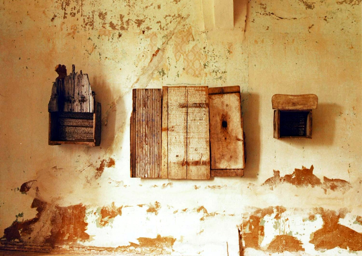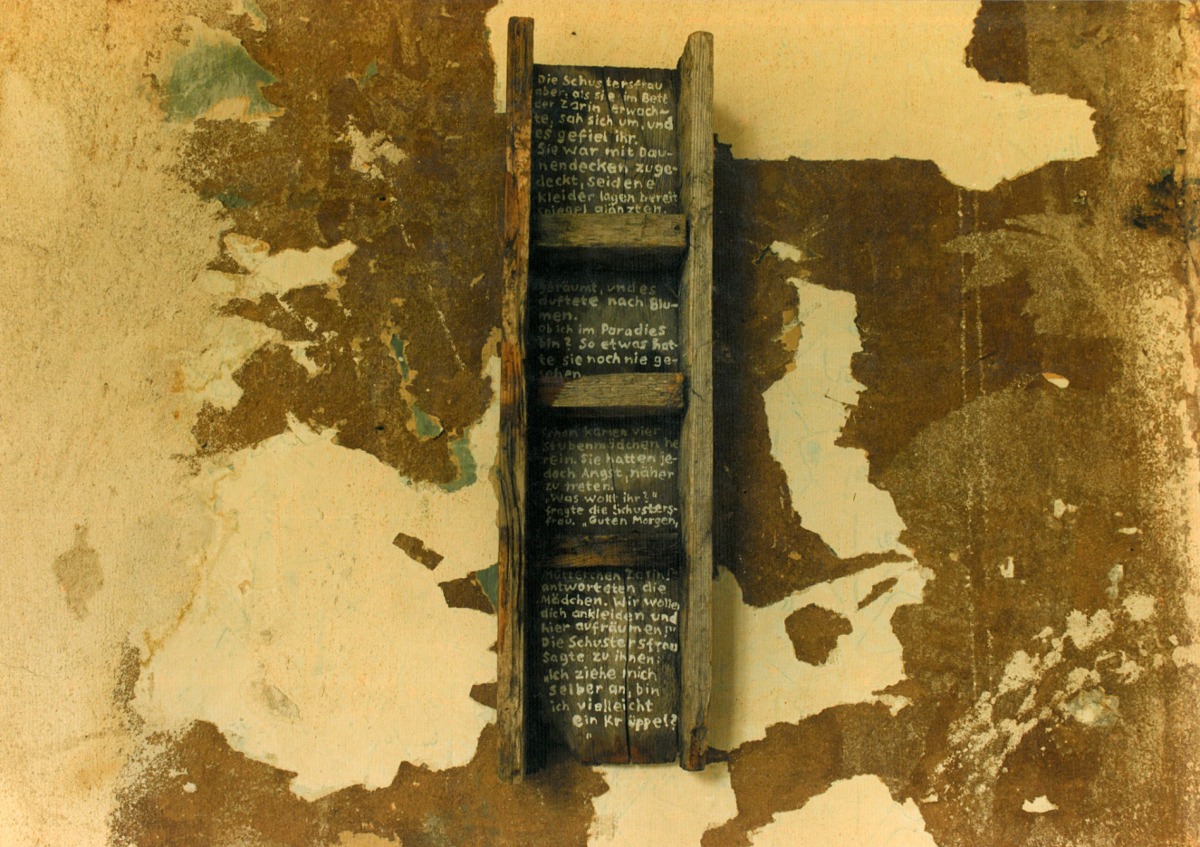Die Schustersfrau als Zarin. 1997. 10 Objekte. Tipp-Ex auf Holz, Dreck, Kückenkot, Nägel, Schrauben, Textilband. Text: russisches Märchen in einer Nachdichtung von Andrej Platonow. Rauminstallation im Renaissance-Schloß Demerthin. Symposium „Die Zimmer“, mit Künstlern der Region. im Rahmen des Prignitzsommers, Landkreis Prignitz