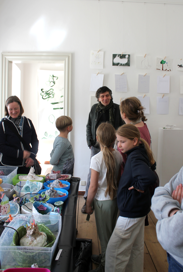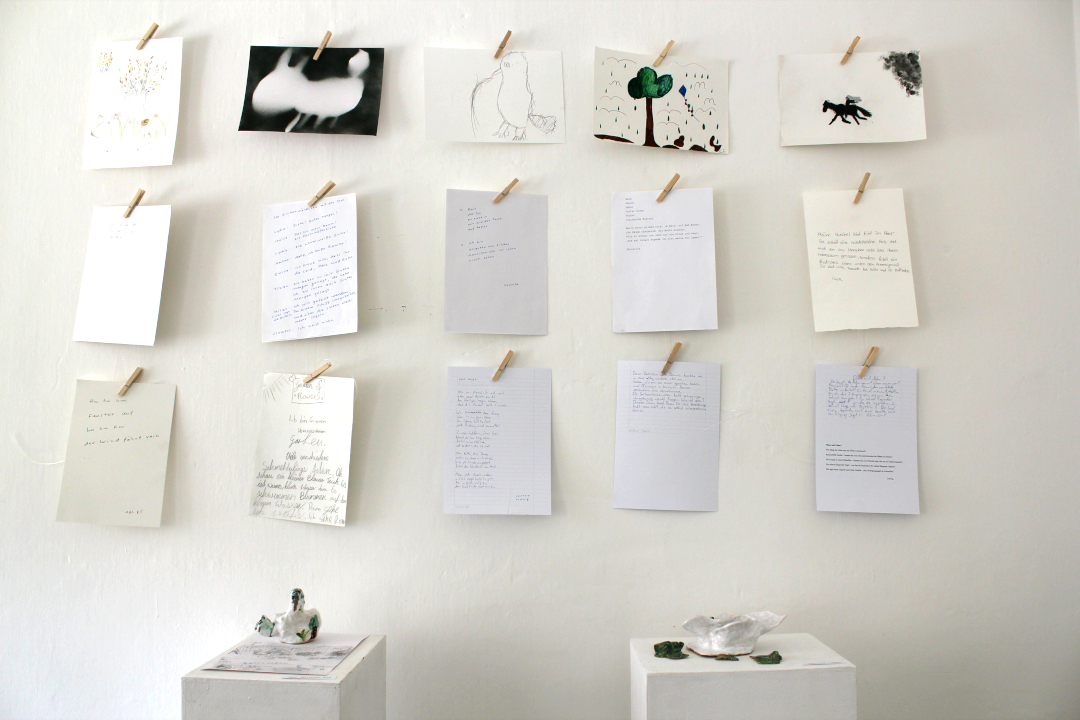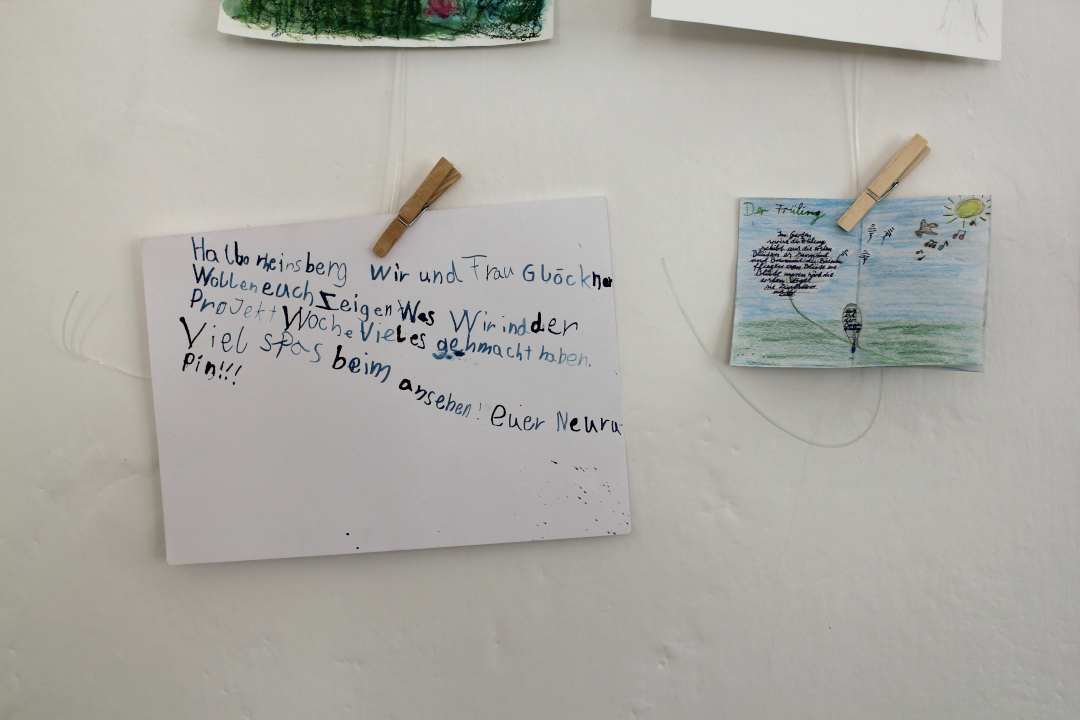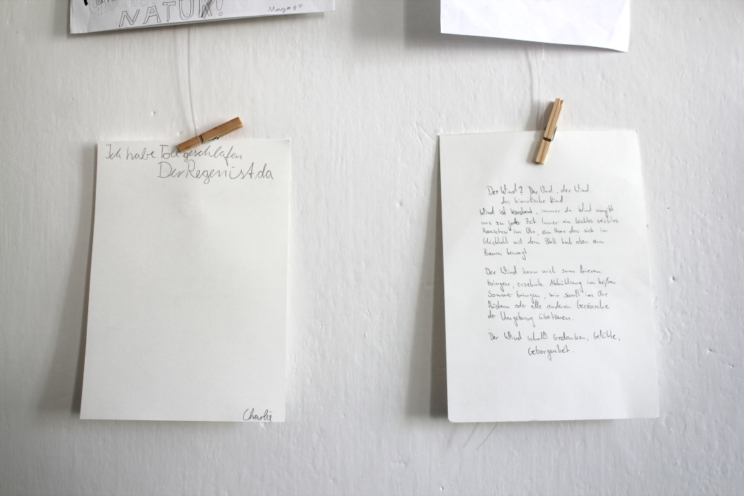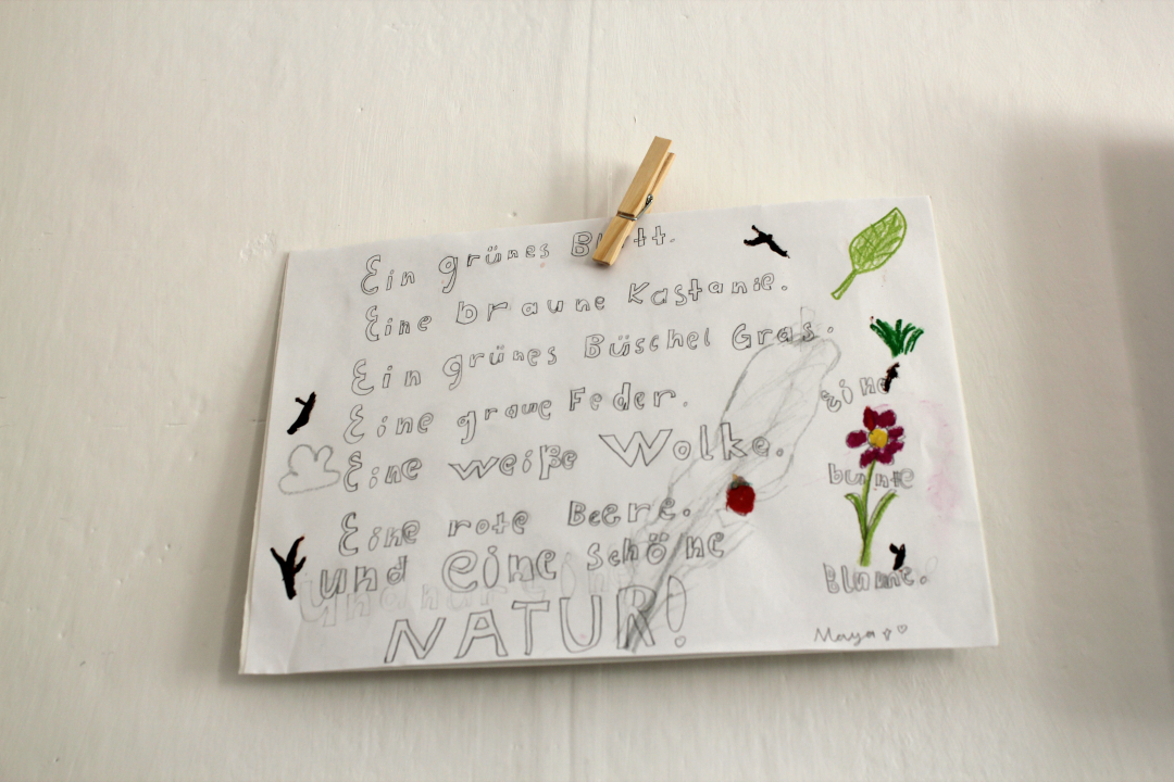 Hallo Natur! Hallo Mensch!. 2025. Kurt Tucholsky Literaturmuseum Rheinsberg. partizipative Rauminstallation, Schuljahres-Projekt, aus bildnerischen Arbeiten und Dichtung von Schülerinnen und Schülern der Evangelischen Schule Neuruppin, im Rahmen meiner Einzelausstellung Dialoge. innerhalb Max – Artists in Residence an Schulen in Brandenburg