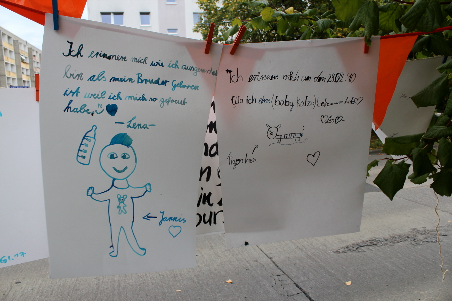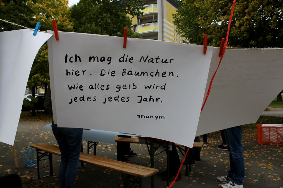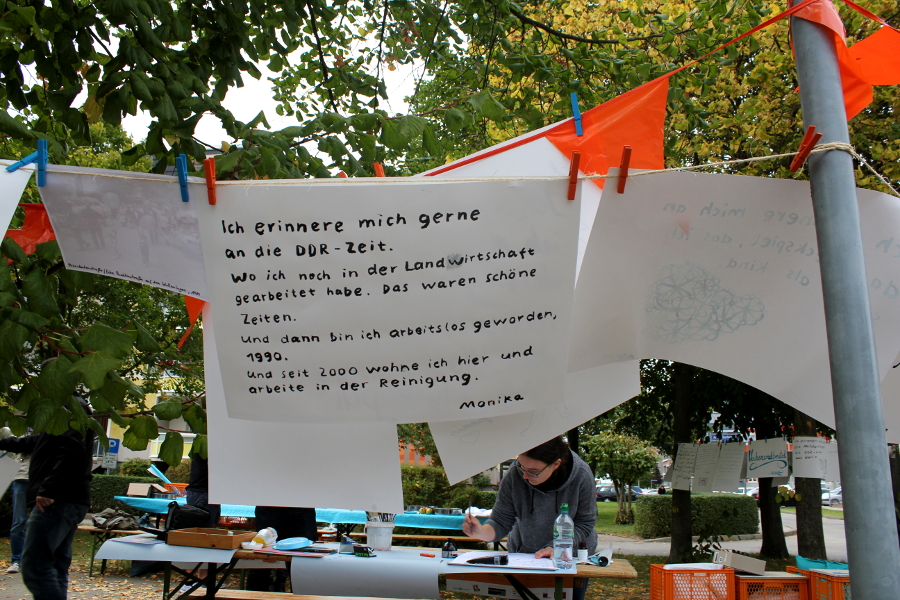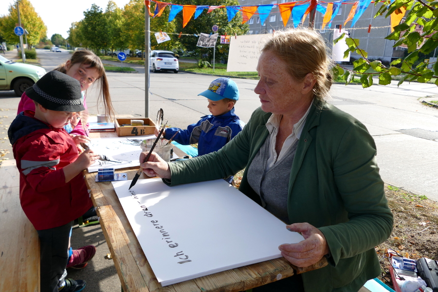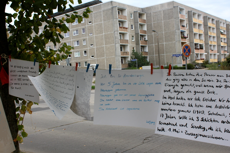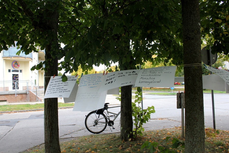Ich erinnere mich an. 2017. Temporäre Kunstaktion mit Alteingesessenen, Zugezogenen, Geflüchteten und Passanten. Schreiben von Erinnerungen mit der Hand, Tusche und Acryl auf Papier und Textil, oder Anleitung zum selbst schreiben, Installation auf der Leine. WK III Neuruppin. Projekt DURCH_EINANDER, Stadtdialog Neuruppin, Museum Neuruppin. mit Maria Döring, Stephanie Lehr, Dorothea Leicht, Sven Jüppner, Galina Güthenke, Maher Azzam u.a.