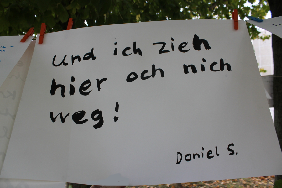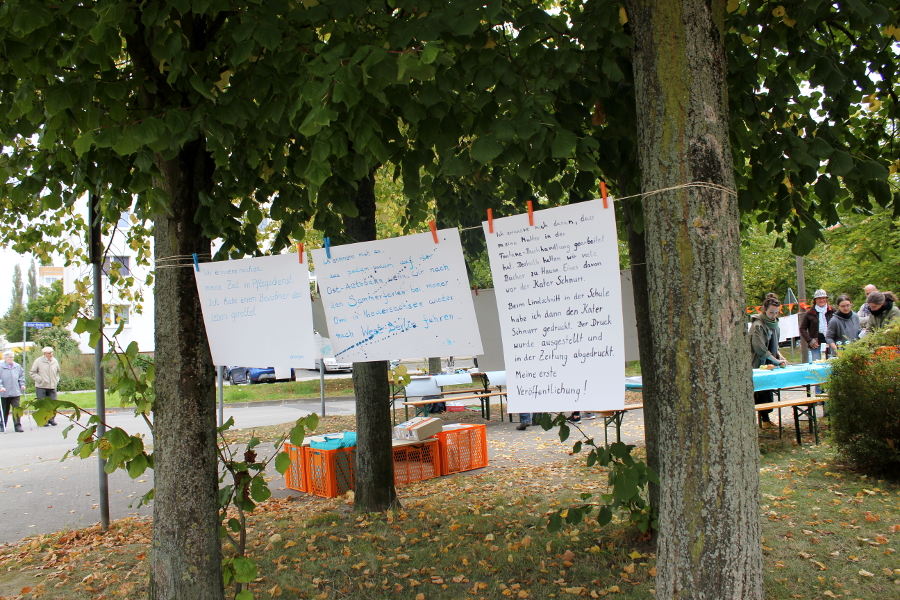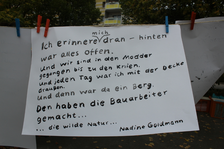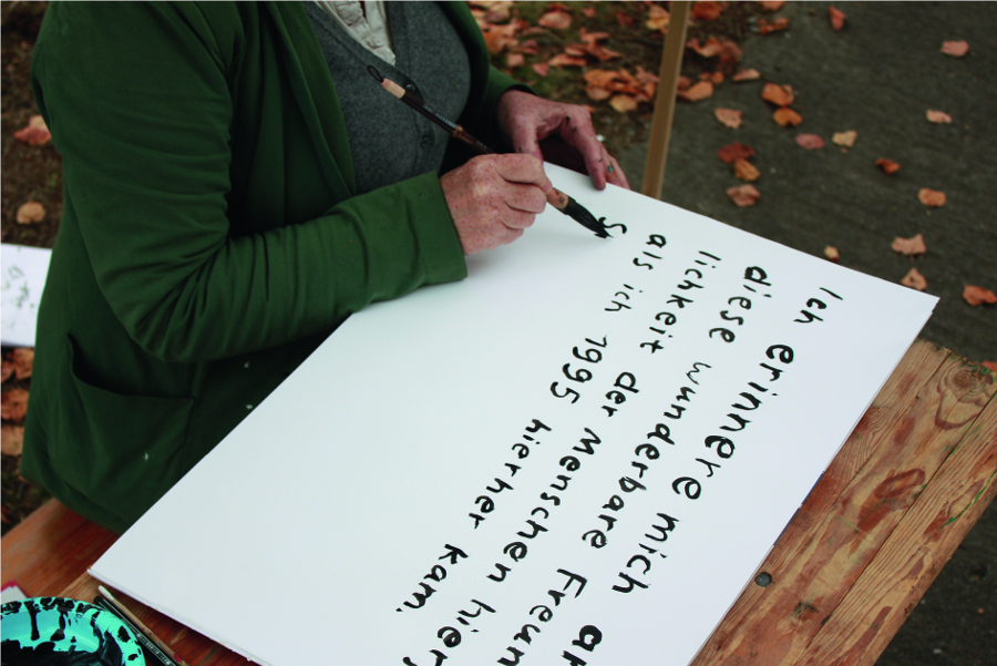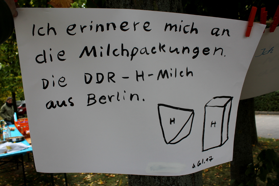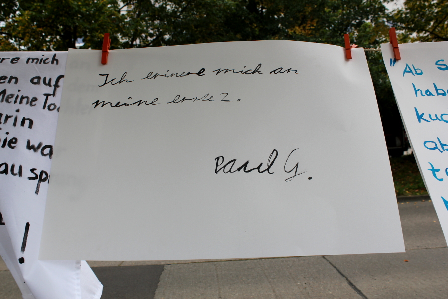 Ich erinnere mich an. 2017. Temporäre Kunstaktion mit Alteingesessenen, Zugezogenen, Geflüchteten und Passanten. Schreiben von Erinnerungen mit der Hand, Tusche und Acryl auf Papier und Textil, oder Anleitung zum selbst schreiben, Installation auf der Leine. WK III Neuruppin. Projekt DURCH_EINANDER, Stadtdialog Neuruppin, Museum Neuruppin. mit Maria Döring, Stephanie Lehr, Dorothea Leicht, Sven Jüppner, Galina Güthenke, Maher Azzam u.a.