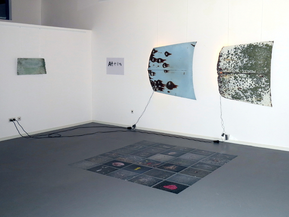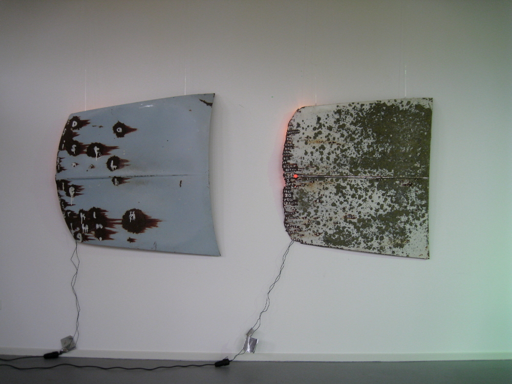rechts: Zärtlichkeit, 2014. Lack auf Motorhaube, Flechten, Rost, Beleuchtung, Text: Annett Glöckner