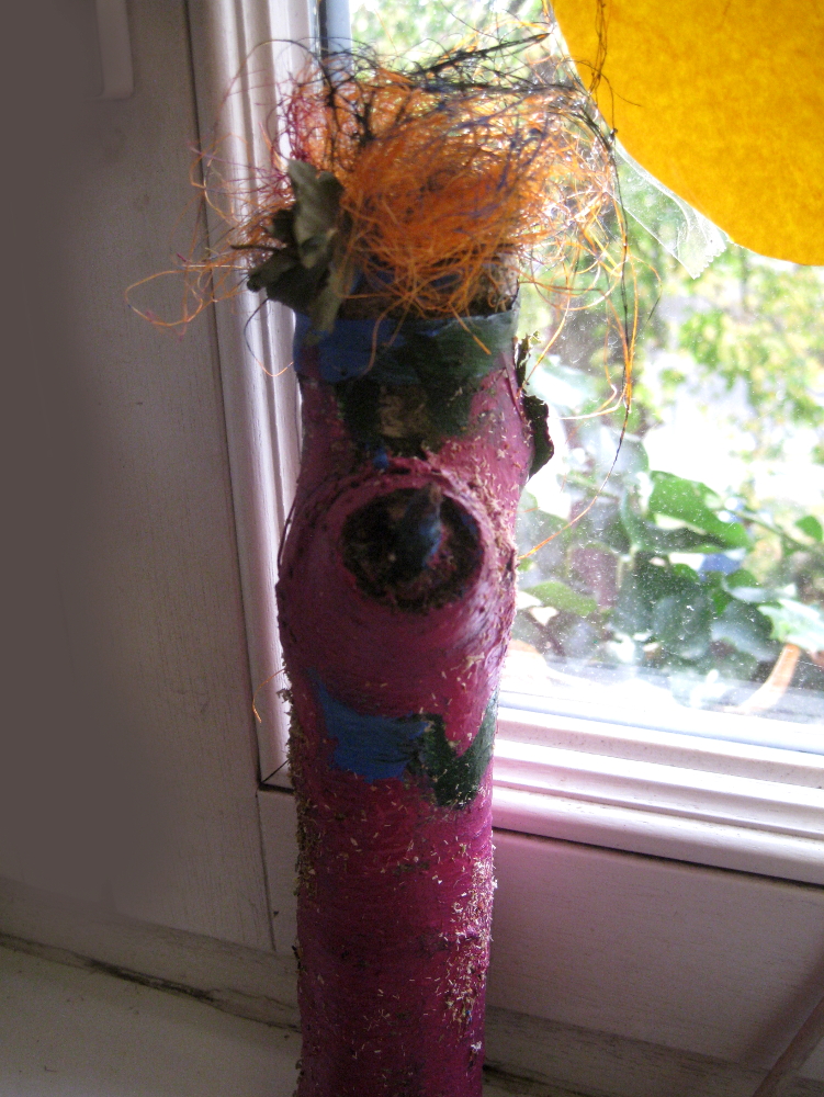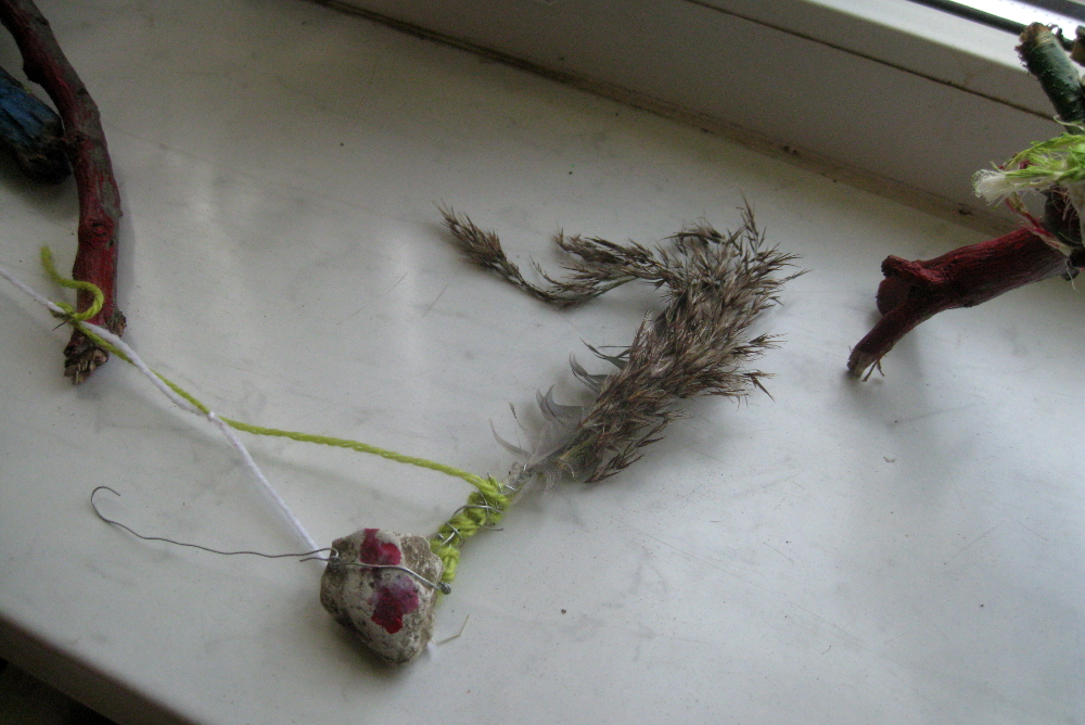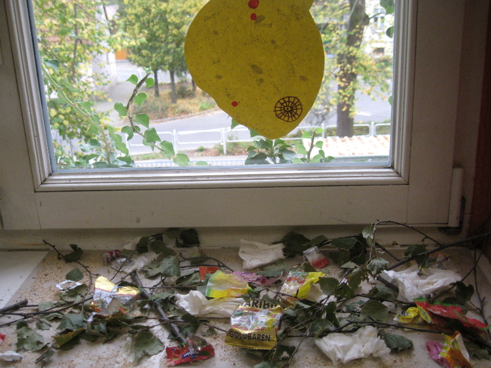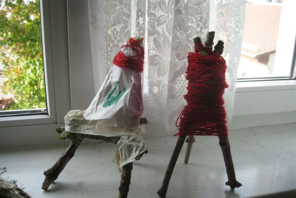 Es waren sonnige Herbsttage. Wir gingen in den Schulgarten und bauten Objekte mit allem, was wir fanden. Mutter Natur gab uns Stöcke, Zweige, Stengel, Blüten, Rispen, Beeren, Dolden, Federn, Blätter, Gras, . . . Wir benutzten nur Bindfaden, Schnur, Wolle, Draht, um das Material zu verbinden. Später machten wir im Klassenzimmer weiter. Da kamen Pappe, Papier, Klebstoffe und Farben hinzu. Es entstanden moderne, innovative Werke. Ein Mädchen aus der Klasse 5a brachte drei große geheimnisvolle Eier mit und baute dafür ein Nest, und ein Junge entwarf eine Schaukel für seinen Vogel. In der Klasse 5b baute ein Schüler eine HipHop-Natur-Göttin, die uns sehr beeindruckte. Ein paar Mädchen arbeiteten zusammen, schufen ein Objekt aus Blättern und Bonbonpapier und hielten einen Vortrag, um auf die Umweltverschmutzung aufmerksam zu machen. Zwei Freundinnen formten eine Felsenlandschaft mit klarem See.