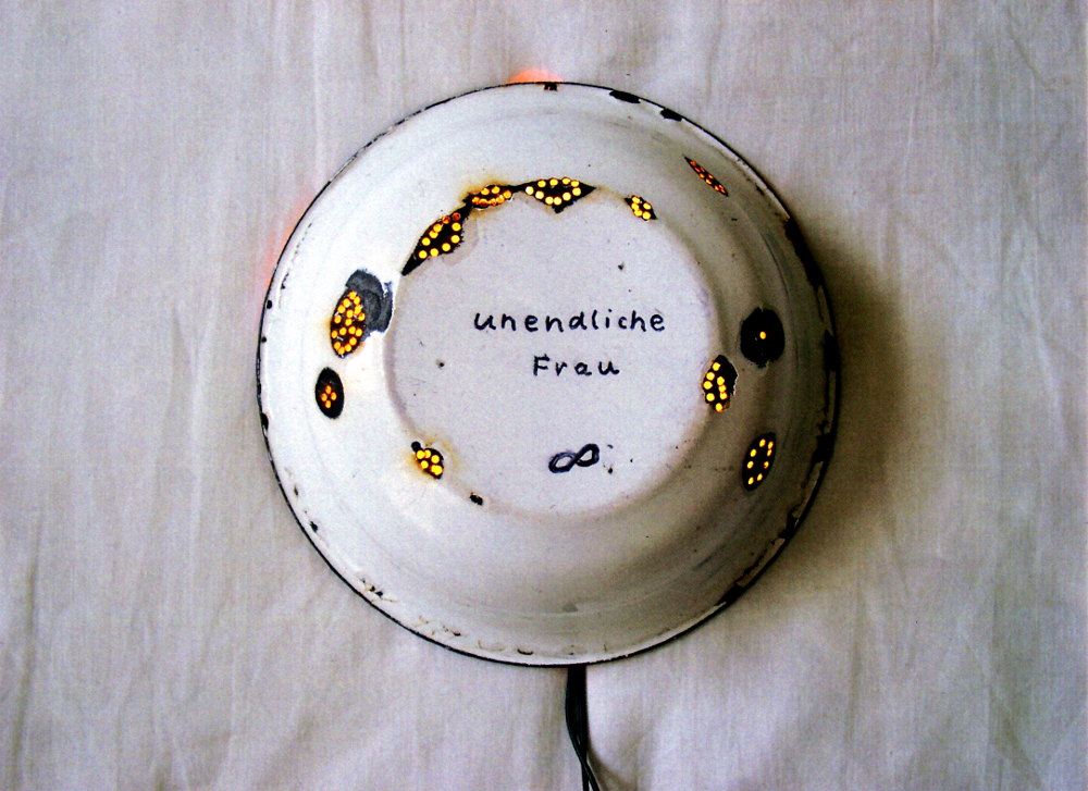 unendliche Frau. 2011. Durchmesser 22 cm, Höhe 15 cm. Marker auf Metall, Emaille, Rost, Beleuchtung.