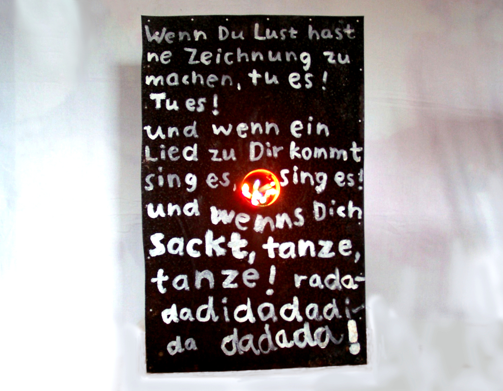 Baba Jaga. 2008 – 2012. Licht- und Text-Objekte mit Fundstücken aus der Landwirtschaft, dem Haushalt, dem Baugewerbe und dem Straßenverkehr: Eimer, Schüsseln, Schirme von Straßenlaternen, Ofen-Einsätze, Ofen-Rohre, Ofen-Bleche, Backbleche, Dachziegel aus Schiefer und Räucherkammertüren. bestückt mit Worten, kurzen Aussagen oder ganzen Texten, meist aus eigener Dichtung. ausgestellt in zahlreichen Einzelausstellungen, z.B. in der Galerie am Bollwerk und der Siechenhauskapelle in Neuruppin, der Inselgalerie Berlin, der Alten Brauerei in Kyritz, im Rathaus Kyritz, im Historischen Haus Schael Wusterhausen, in der Kreisbibliothek Kyritz und in der Gruppenausstellung „Kyrkhud presenterar“ in Dalsland in Schweden. Vielen Dank Otto Glöckner für die technische Hilfe!