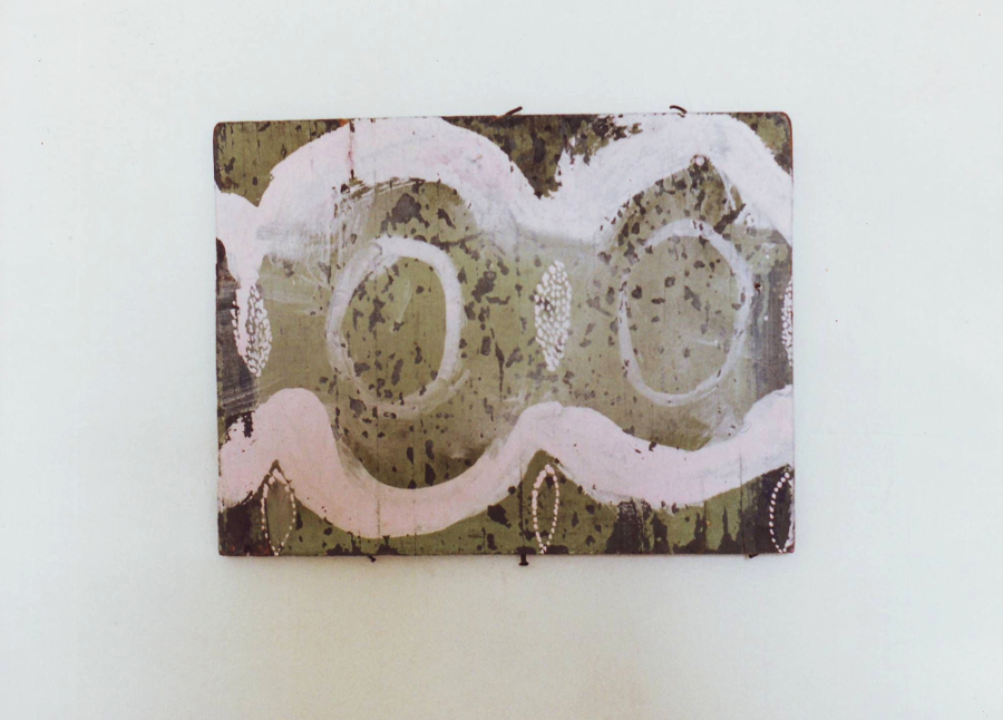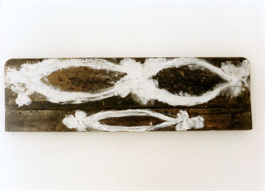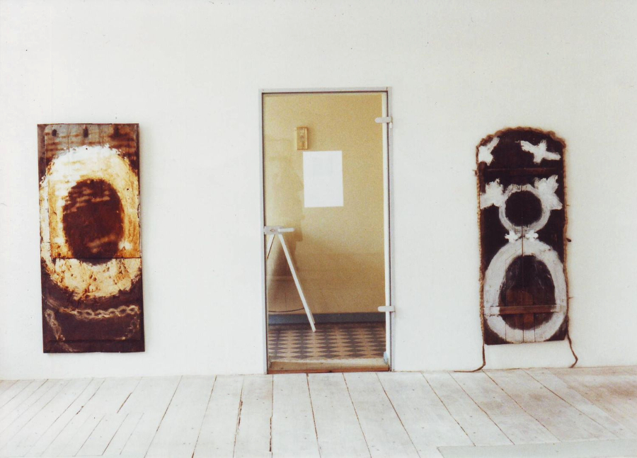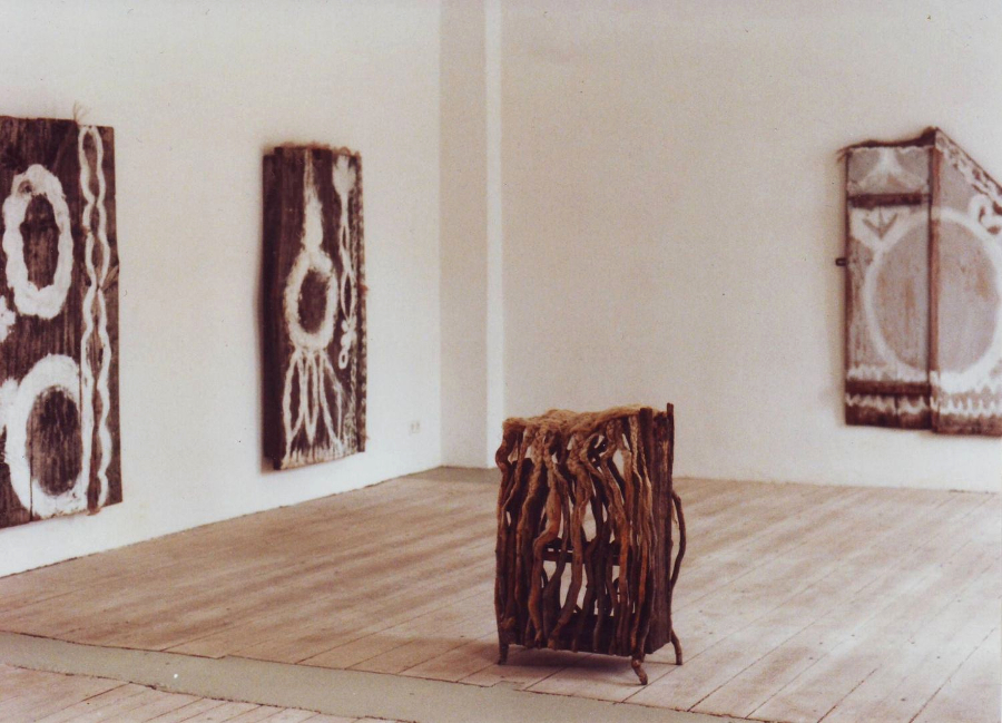 Grasland 2. 2001. Kunstraum Neuruppin. Objekte aus der Landwirtschaft, Acryl auf Holz, Sperrholz, Blech, Moos. Rede Eröffnung: Bernhard Boës. Ein besonderer Dank gilt Winfried Muthesius.