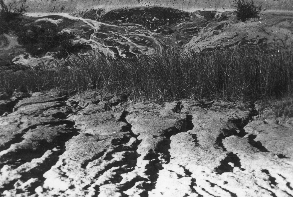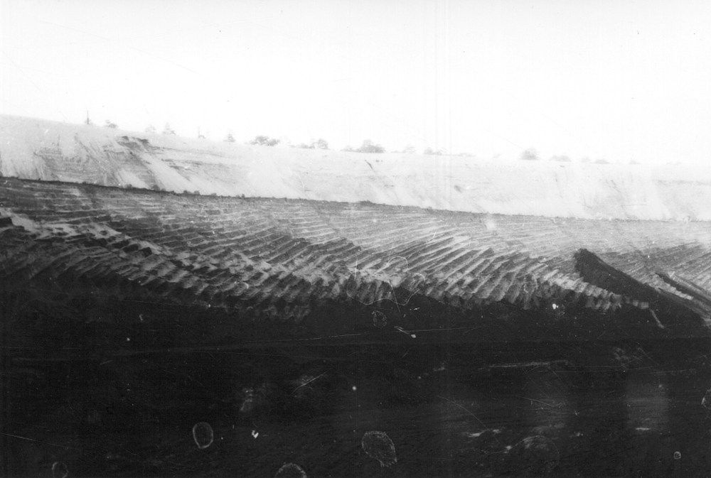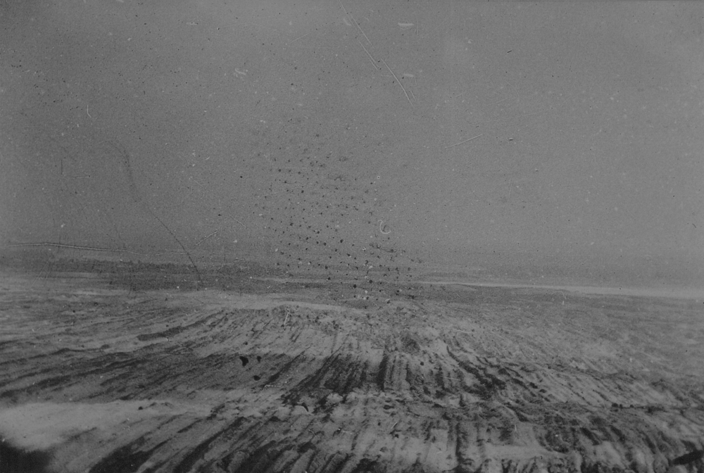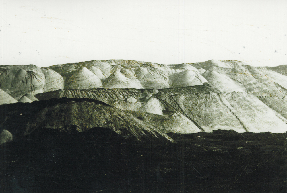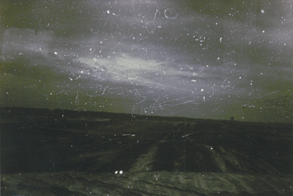 Landschaft. 1991. aus einer Fotoserie schwarz-weiß, analog, Abzüge von verkratzten und beschädigten Negativen. Langzeitprojekt in den Braunkohlengebieten der Lausitz und um Leipzig. Spaziergänge, Autofahrten, Flüge – Fotoserien, Diaserien, Audio-Collagen, Videofilme, Texte. innerhalb der Diplomarbeit „Braunkohlentagebau als optisches und landschaftliches Phänomen“. Hochschule der Künste Berlin.