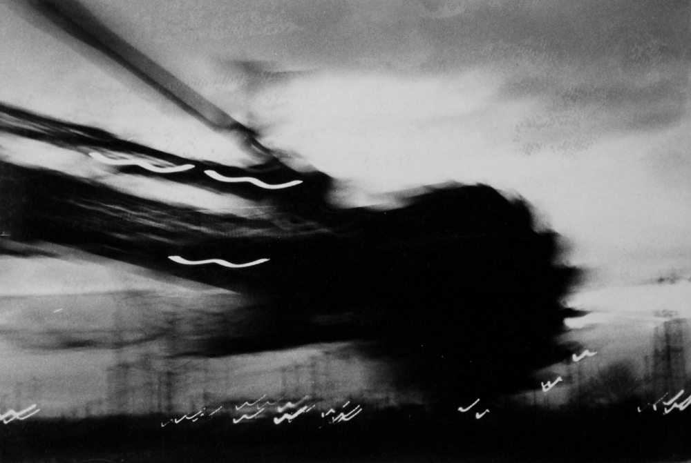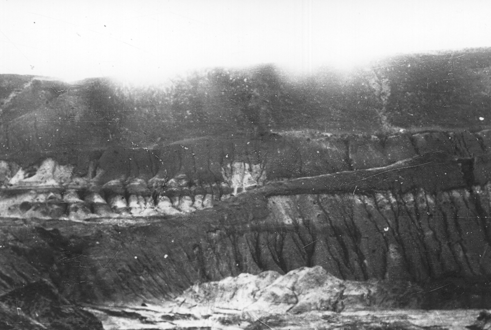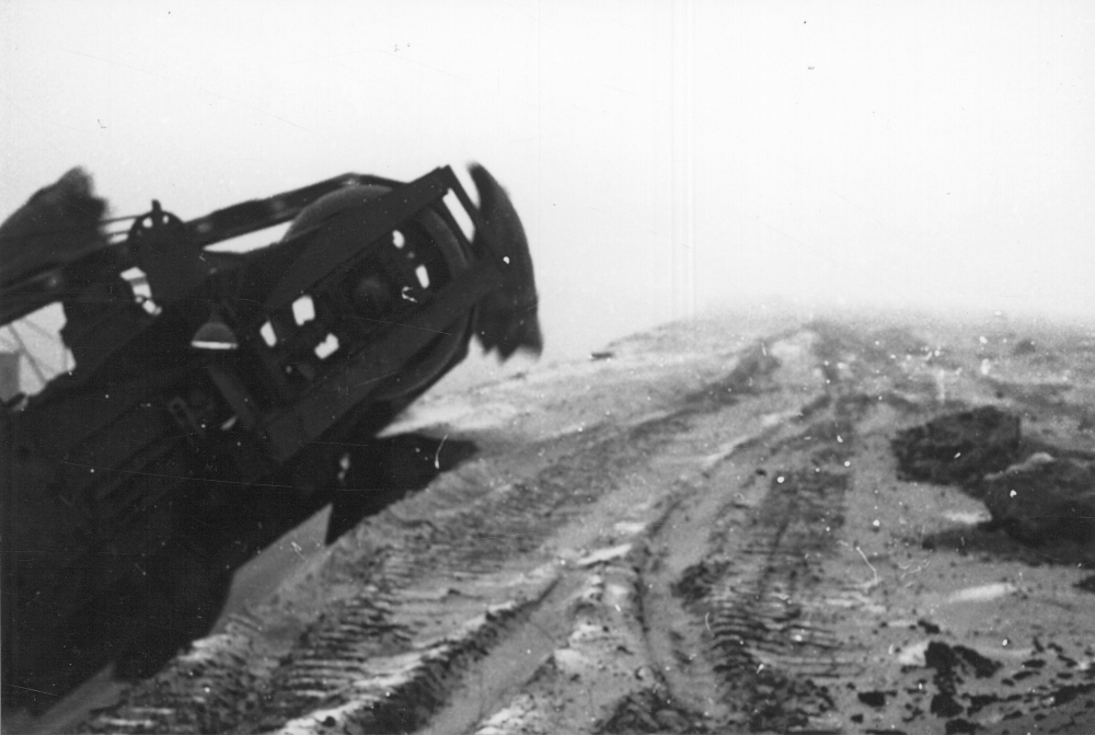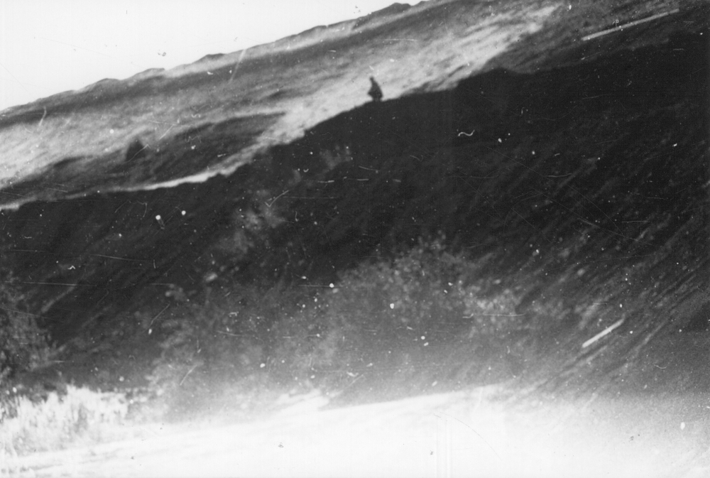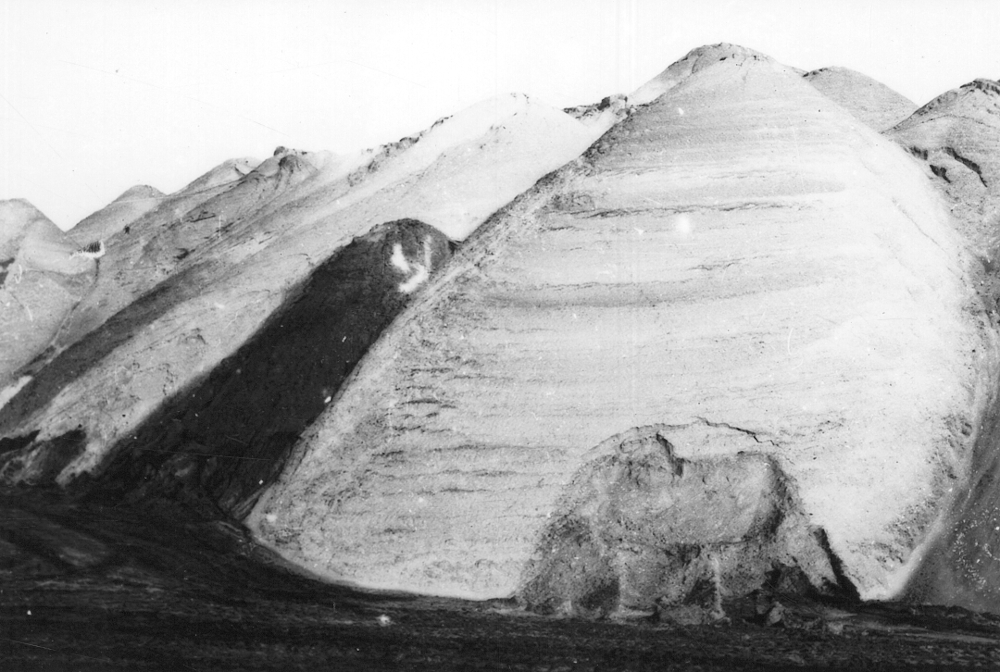 Landschaft. 1991. aus einer Fotoserie schwarz-weiß, analog, Abzüge von verkratzten und beschädigten Negativen. Langzeitprojekt in den Braunkohlengebieten der Lausitz und um Leipzig. Spaziergänge, Autofahrten, Flüge – Fotoserien, Diaserien, Audio-Collagen, Videofilme, Texte. innerhalb der Diplomarbeit „Braunkohlentagebau als optisches und landschaftliches Phänomen“. Hochschule der Künste Berlin.